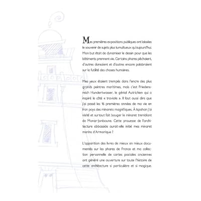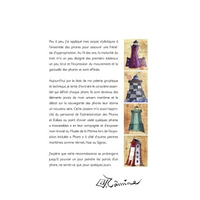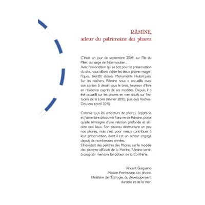 Artiste brestois d’origine persane, Râmine met en lumière et en couleurs 80 feux de France à travers ses dessins, peintures et compositions. De Dunkerque Le Mauresque à Giraglia, premier éclat de Corse en passant par Ploumanac’h Le Rose ou bien encore Faraman Le Camarguais, tous ont été visités, croqués, interprétés par un amoureux. Chacun possède une personnalité et une histoire que l’auteur a cherché à dompter ou amadouer. Cette collection est au centre de la recherche graphique de Râmine depuis plus de dix ans !Découvrez ceux qu’il aime par-dessus tout, ceux qui lui ont coûté des heures de travail, mais aussi ceux qui ont été l’occasion de rencontres humaines fortes et marquantes à travers textes, dessins, travaux préparatoires et croquis de travail inédits à travers ce joli petit livre attrayant, préfacé par Vincent Guigueno, historien et commissaire de l’exposition " Phares" > Les phares de Râmine seront mis à l’honneur lors de l’exposition " Phares ", présentée au musée national de la Marine puis dans les musées régionaux, du 7 mars au 4 novembre 2012. Liste des phares • Dunkerque • Sandettie • Calais • Ault • Ailly • La Hève • Le Havre • Ouistreham • Gatteville-Barfleur • La Hague raz Blanchard • Chausey • Le Grand Jardin • Cap Fréhel • Le Grand Léjon • Roches-Douvres • Héaux • La Croix-donjon du Trieux • Bodic • Ploumanac’h • Triagoz • Île Noire et île Louët • Batz le Léonard • Pontusval • Île vierge • Le Stiff • Créac’h • La Jument • Kéréon • Donjon du four d’Argenton • Pierres Noires • Saint Mathieu • Kermorvan-Le Conquet • Petit Minou • Le Portzic • La Vieille du Raz • Tévennec • Sein • Ar Men • Eckmühl • Les Perdrix • La Pyramide du coq • Les Moutons • Penfret • La Croix-de-Concarneau • Pen Men le Groisillon • Port Maria • Port Navalo • La Teignouse • Birvideaux • Goulphar et Belle-Île • Les Grands Cardinaux • Pen-Lan de la Vilaine • Le Four du Croisic • La Banche et Le Grand-Charpentier • Le(s) Pilier(s) du ciel • La Pointe des Dames • Île d’Yeu • Saint-Gilles-Croix-de-Vie • Les Barges d’Olonne • La tour d’Arundel • Les Baleines • La Rochelle • Chassiron • La Coubre • Le Cordouan • Cap Ferret • Le Contis • Biarritz • Port Vendres et Cap Leucate • Faraman • Cap Couronne • Planier • Le Grand Raveau • Porquerolles • Caps Bénat et Camarat • La Garoupe • Cap Ferrat • Giraglia • Le Phare des Sanguinaires • Pertusato • Lavezzi • Chiappa • Alistro.